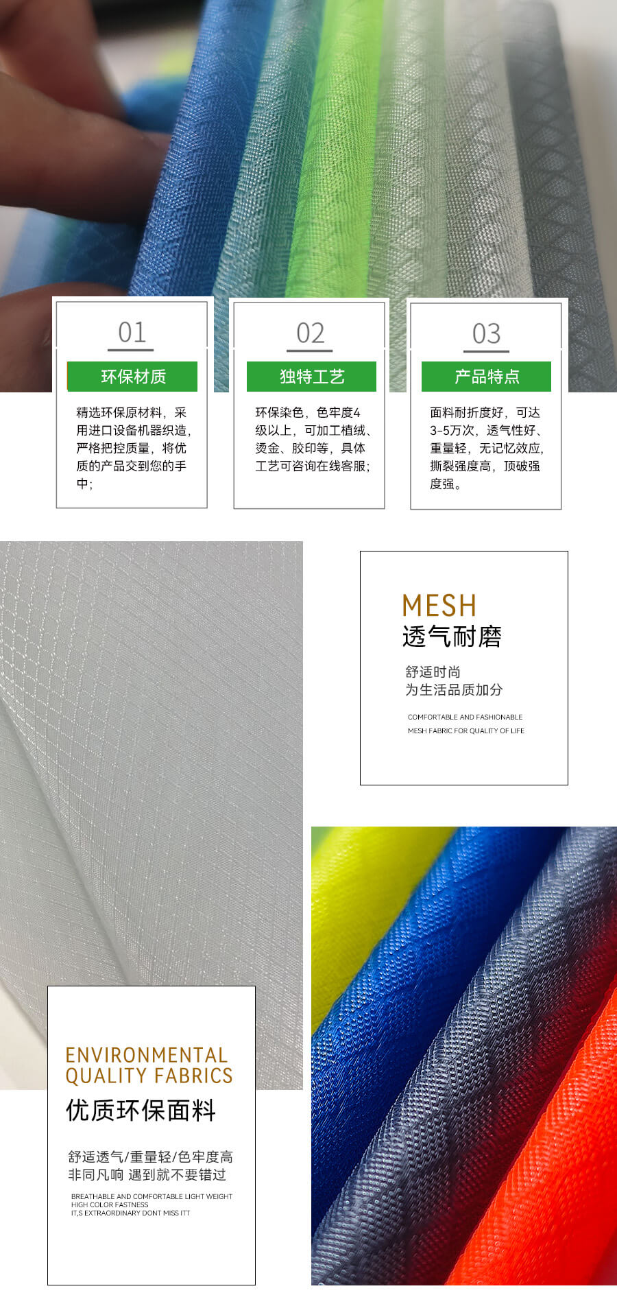 優點是透氣、韌性足、耐磨、耐腐蝕。面料使用壽命長。非常適用于運動鞋、休閑鞋、帽子、沙灘包等產品。