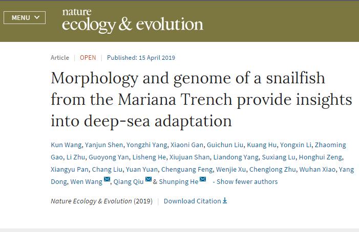 中國科學院深海科學與工程研究所和水生生物研究所與西北工業(yè)大學聯(lián)合攻關(guān),對生活在馬里亞納海溝7000米以下的獅子魚開展了多方面的深入研究,在分類學上厘清了其系統(tǒng)地位,首次在形態(tài)上發(fā)現(xiàn)其適應(yīng)深淵的變化,在多組學大數(shù)據(jù)分析的基礎(chǔ)上揭示了深淵適應(yīng)的遺傳基礎(chǔ)。北京時間41523時許,該研究成果在線發(fā)表于英國自然雜志子刊Nature Ecology & Evolution(自然-生態(tài)與進化),題為《Morphology and genome of a snailfish from the Mariana Trench provide insights into deep-sea adaptation》。深海所為第一作者單位和第一通訊作者單位。