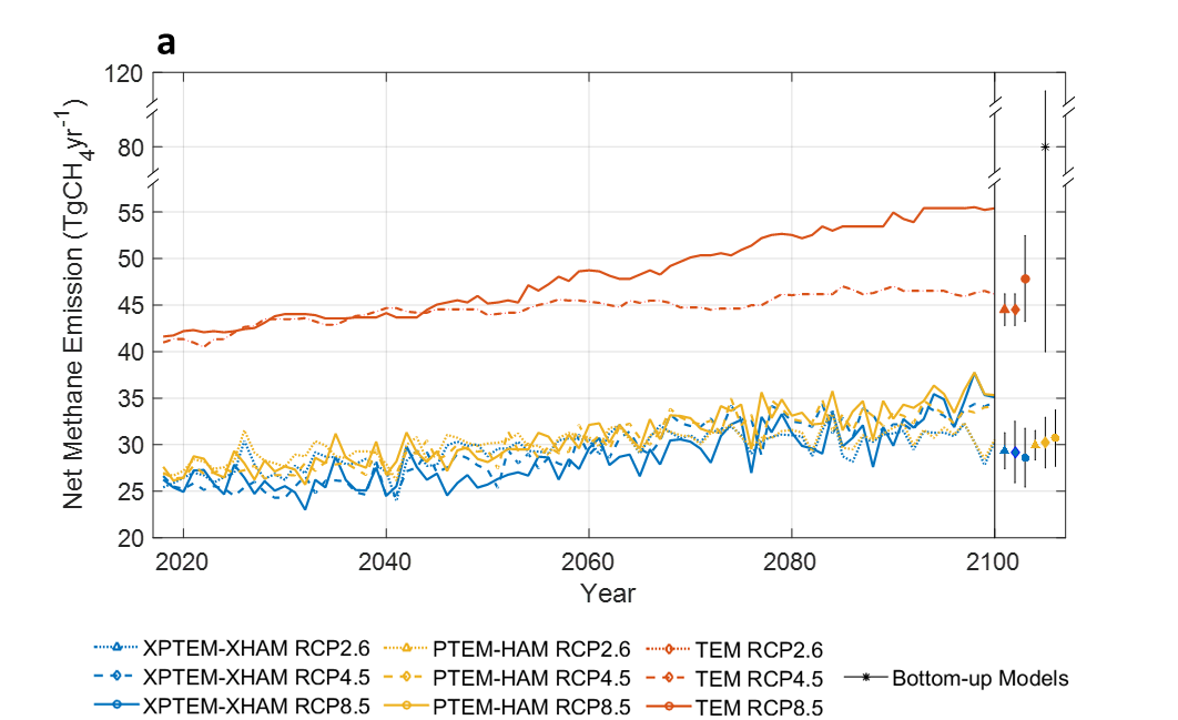 從2017年到2100年北極(北緯50°以上)年度凈甲烷排放量預(yù)測