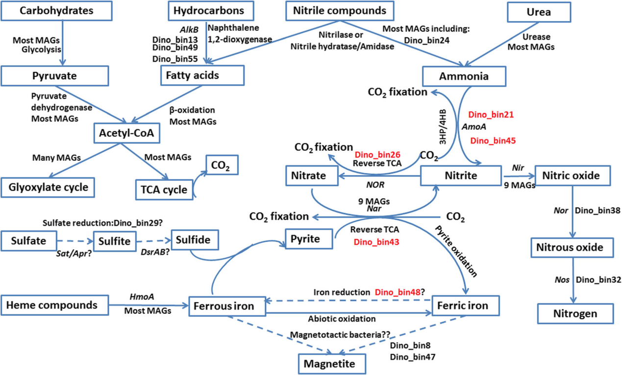 本研究從宏基因數據組裝出46個高質量的基因組,分別代表6個細菌門及1個古菌門。基因組的分析和比較結果指出這些基因組大部分都顯示是新的綱、目、科、屬或種且未曾成功被分離為純培養。相比包裹骨骼的泥巖樣品,骨骼富集了Nitriliruptoria, Deltaproteobacteria and Betaproteobacteria幾個綱里的基因組。對基因組功能基因的詮釋,揭示了多個物種可能參與碳、氮、硫和鐵的代謝。蛋白組學分析發現很多微生物基因已表達,相反,沒有發現內源性恐龍膠原蛋白肽。研究表明:出土的恐龍骨骼是微生物(包括新譜系)的棲息地;與外部沉積物相比,骨骼化石內部獨特的微生境和地球化學組分支持了較高的微生物生物量,也包含多組基因相互聯系的生物地球化學過程;這些微生物群落在中生代恐龍化石中的存在敦促科學家們在尋找殘存的內源性生物分子時,必須格外審慎。