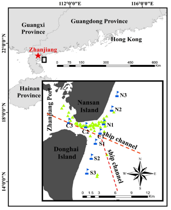 2(左)湛江港的中華白海豚目擊位點和采樣地點地圖(右)湛江港入??隰~類資源、風險水平和中華白海豚分布關系圖