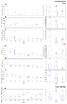 4 (左)被動聲學監(jiān)測位點和平臺(右)被動聲學監(jiān)測位點中每個文件檢測到的回聲定位信號次數和位點之間的差異
