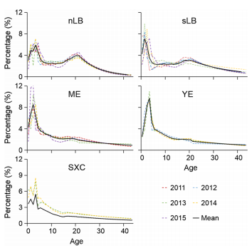 3 (左)珠江口印太駝海豚的體色變化規(guī)律(右)2011 - 2015年五個子研究區(qū)印太駝海豚年齡組成的空間差異