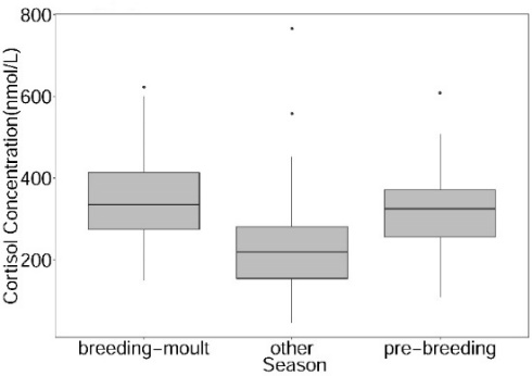 5.2020511日,期刊Aquatic Mammals在線發(fā)表了題為“Aging and Seasonal Serum Cortisol Concentrations in Captive Spotted Seals (Phoca largha) from the Liaodong Bay Colony”的文章。研究團隊對遼東灣人工養(yǎng)殖斑海豹皮質醇濃度積聚規(guī)律進行了分析并探討其在生殖周期中生理狀態(tài)的變化。研究表明,斑海豹皮質醇水平隨年齡的增長緩慢降低并以6歲作為轉折點后緩慢升高(圖5 左);在性成熟和非性成熟期間,不同性別間皮質醇濃度并無顯著差異,但在不同季節(jié)皮質醇濃度存在顯著差異(圖5 右)。本研究為判斷野生斑海豹健康狀況建立了一個參考標準,同時可以用作評估其受自然或人為脅迫的壓力響應。