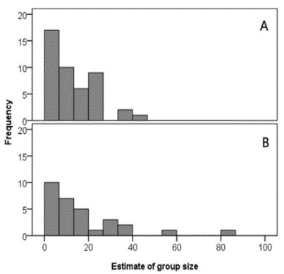 6 (左)研究范圍地圖(右)現場計數和照相識別的集群大小的直方圖分布