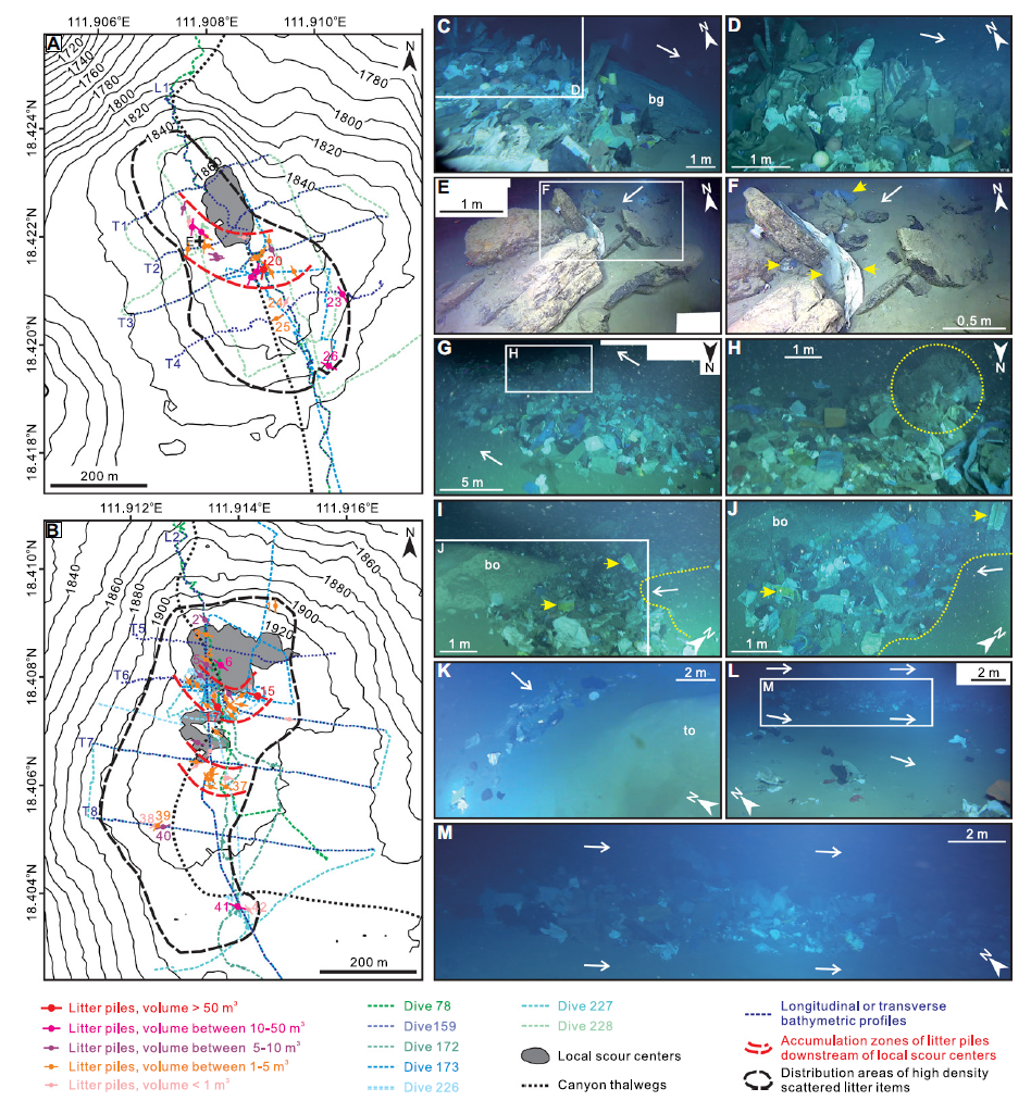 (A-B)多波束地形圖,示塑料垃圾堆在沖坑1(A)和沖坑2(B)中的分布。(C-M)典型塑料垃圾堆的深潛照片:(C)沖坑1垃圾堆20,bg為位于該垃圾堆下游翼的一大袋垃圾;(D)C中垃圾堆特寫(xiě),顯示大袋垃圾上游呈疊瓦狀分布的片狀塑料垃圾;(E-F)沖坑1中塑料與角礫的混合堆積,解釋為碎屑流沉積;(G-H)最大垃圾堆(沖坑2垃圾堆17)中段特寫(xiě),黃色圈出部分為高達(dá)5-6米高的樹(shù)形大垃圾集合體;(I-L)2019年和2020年潛次拍攝到的同一垃圾堆(沖坑2垃圾堆15)的形狀和垃圾組份的變化;bo為4-5米高的大漂礫,垃圾堆位于該漂礫上游側(cè);(K)沖坑2垃圾堆37,位于地形突起(to)上游側(cè);