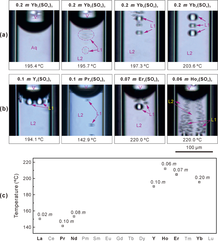 研究表明,含稀土硫酸鹽熱液在高溫條件下可分離為不混溶的兩種液相,一為高度富集REE和硫酸鹽的高密度液相(L1),一為貧REE和硫酸鹽的低密度液相(L2) (圖1)。這種現象傾向于在富CO2、低壓和低氯化物含量的熱液中發生。由于不混溶的兩個液相具有明顯的密度差異且貧REE液相作為基質具有較低的粘度,富REE液相將在重力作用下與貧REE液相高效分離,從而實現熱液體系中REE的高效富集,為高品位稀土礦床的形成提供物質基礎。
