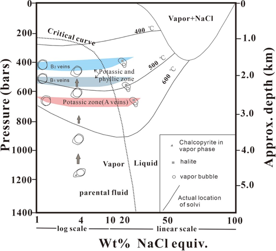 圖. 朱諾流體包裹體鹽度-壓力相圖(H2O-NaCl 體系)