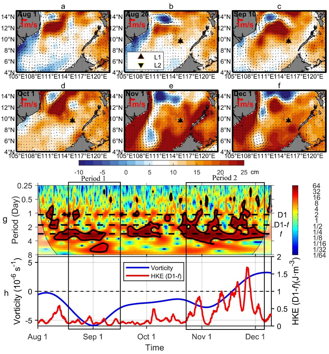 圖1. 觀測期間南海南部海表高度異常和地轉(zhuǎn)流場分布(a-f),235米深度徑向流速小波能量譜(g),235-350米深度垂向平均渦度(藍(lán)線)和D1-f內(nèi)波HKE(紅線)時(shí)間變化(h)。