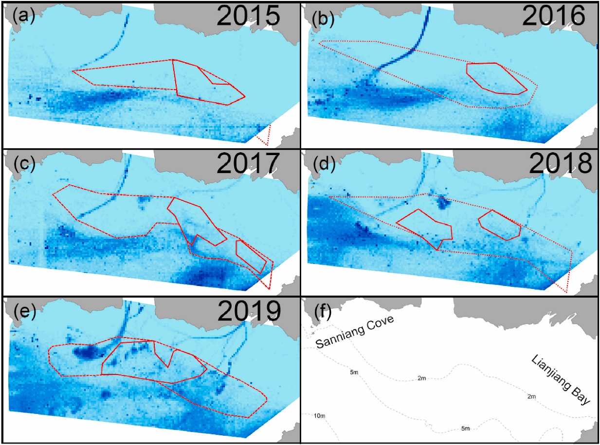 1. a-e展示2015-2019年大風江口水域船舶活動;f展示三娘灣、廉江灣位置