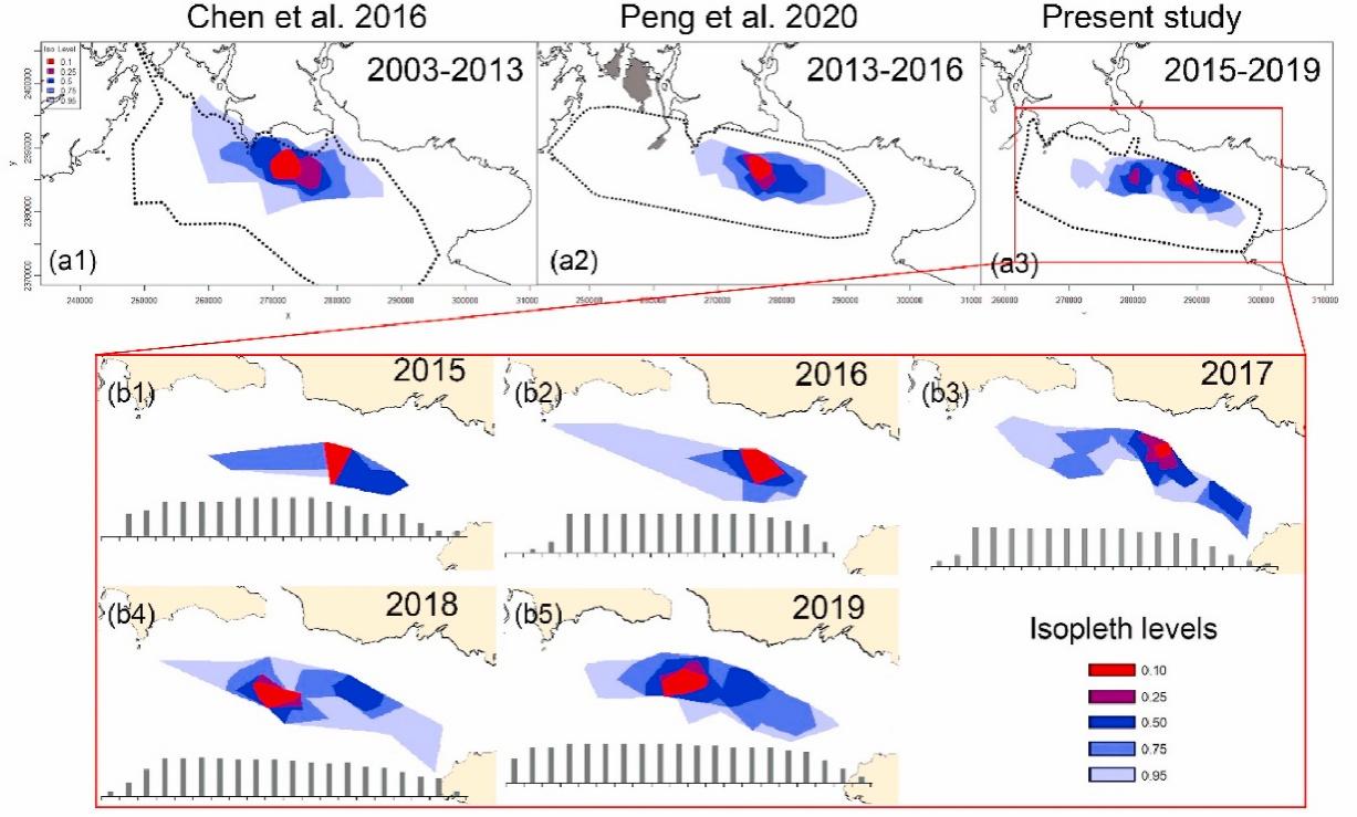 2022年12月20日,中科院深海所海洋哺乳動物研究團隊與汕頭大學研究團隊合作,在國際學術期刊Journal of Environmental Management發表題為《Ranging pattern development of a declining delphinid population: A potential cascade effect of vessel activities的研究文章。該研究提取了北京大學、北部灣大學、廣西省科學院等團隊在北部灣大風江口水域(下稱該水域)的已發表目擊數據,并整合了深海所與汕頭大學2015年至2019年間系統調查結果,分析該海域中華白海豚空間分布的長期變化。研究結果顯示,該水域中華白海豚的活動范圍在本世紀初顯著減少。盡管海豚的整體活動范圍在近十年內較為穩定地集中在三娘灣至廉江灣一帶海域,但海豚的核心棲息地存在明顯的偏移。與早期空間分布模式相比,該海域的海豚核心棲息地在2015-2017年間從三娘灣沿岸東移至廉江灣外圍海域,而又在2018-2019年稍回落至三娘灣一側。