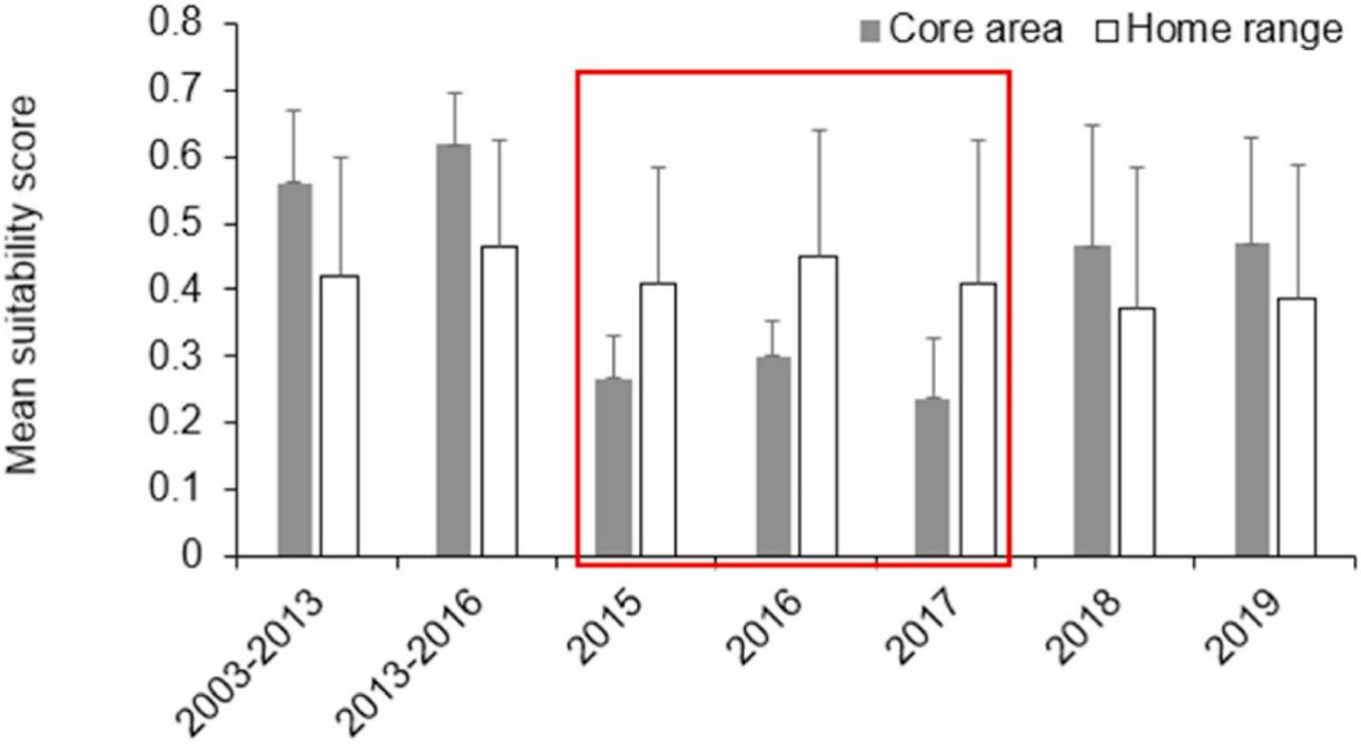 該研究進一步建立了該水域中華白海豚環境適合度模型,發現該種群在2015-2017年的核心活動范圍并非白海豚的最適宜棲息地。此期間海豚核心活動范圍的棲息地平均適合度甚至要低于整體家域的平均適合度。與之對應的是,研究團隊不久前發現該水域中華白海豚的存活率在棲息地東移期間處于極低水平。基于這些發現,研究人員提出該水域中華白海豚種群波動的新假說:船舶活動的快速增長改變了中華白海豚的空間利用策略,進入船舶活動強度低但適合度較低的水域活動;而在低適合度的環境生活的風險造成適應度大幅降低,并經歷了快速的種群衰退。最終海豚權衡船舶和棲息地適合度的影響,重新調整空間使用策略而回到船舶活動強度高但適合度更高的水域生活。