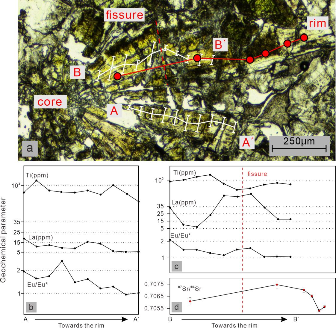 本研究發現U1502B鉆孔蝕變玄武巖中出現的綠簾石脈破碎嚴重,具有再膠結現象和環帶結構,表明在綠簾石脈形成時,鉆孔附近區域構造運動活躍。根據綠簾石的稀土元素和原位Sr同位素組成特征(圖2),可以推測U1502B鉆孔熱液系統的循環流體包括三種類型:(1)改性海水(具有負Ce異常,87Sr/86Sr = ~0.708);(2)高溫熱液(具有正Eu異常,87Sr/86Sr = ~0.706);(3)巖漿流體(具有負Eu異常,87Sr/86Sr = ~0.704),且以高溫熱液流體為主。