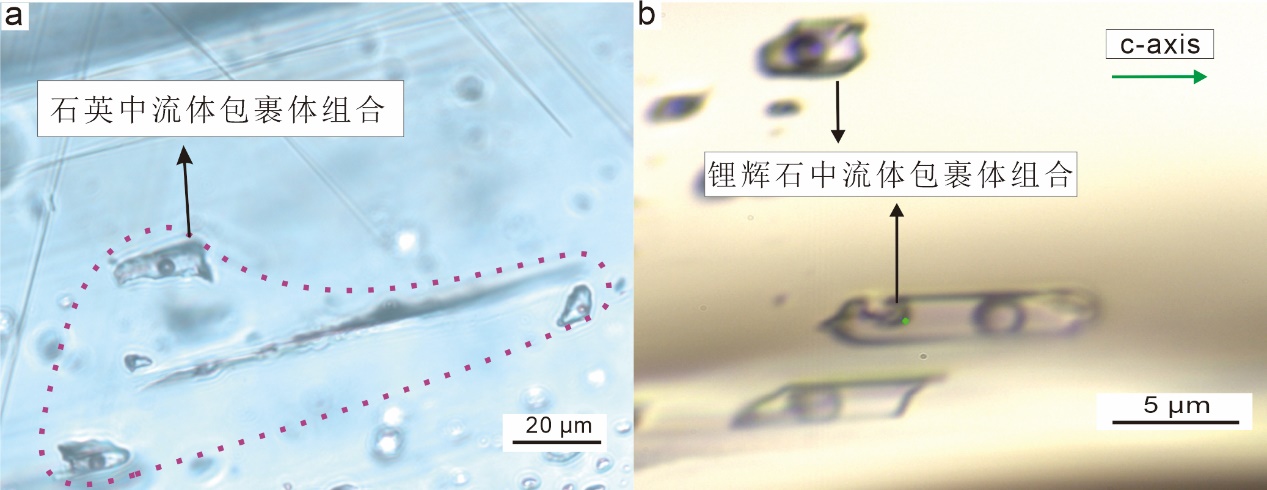 圖1. 李家溝成礦偉晶巖中的流體包裹體顯微鏡下特征。a)石英的富液相流體包裹體組合,沿次生裂隙分布;b)鋰輝石中的富液相流體包裹體組合,沿鋰輝石晶體C軸分布。