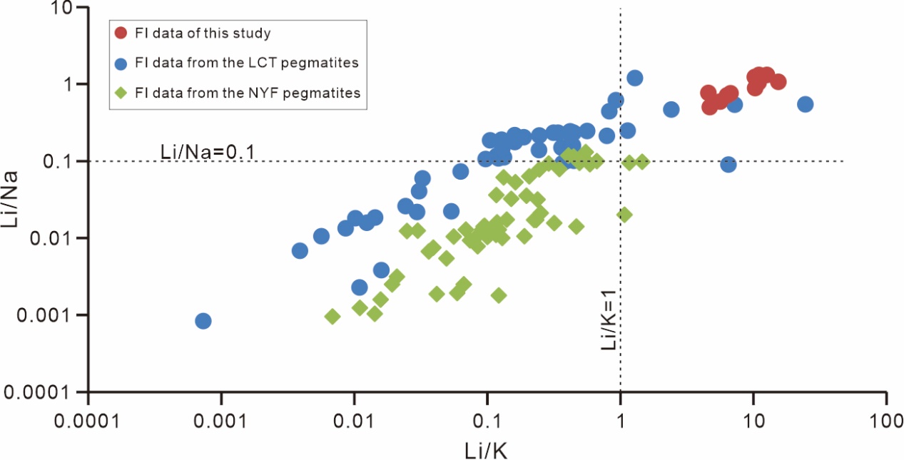 圖2. 此次研究獲得的流體包裹體(FI)中的Li/Na與Li/K的比值, 以及前人報道的鋰-銫-鉭(LCT)和鈮-釔-氟(NYF)偉晶巖體系的研究結(jié)果。