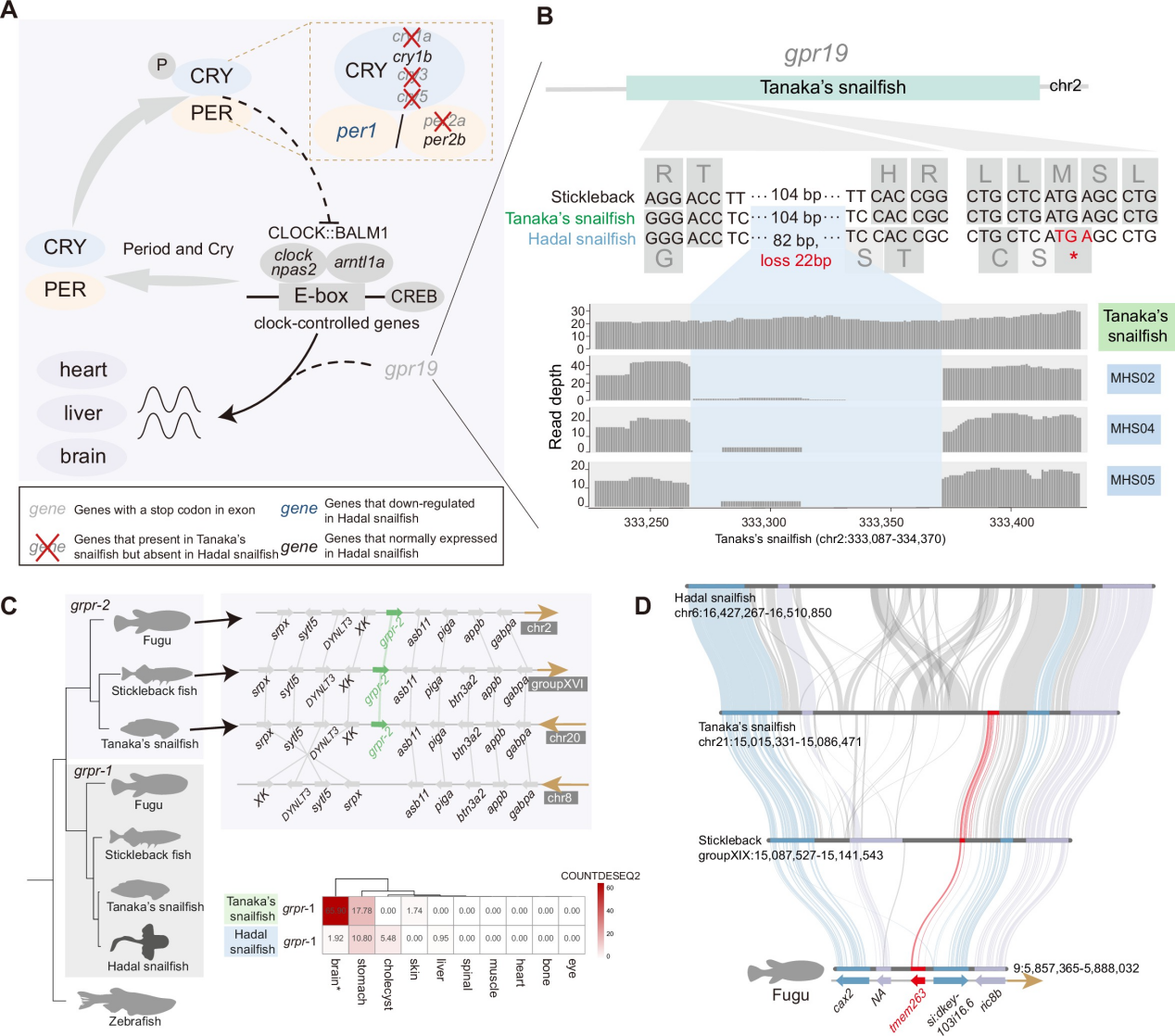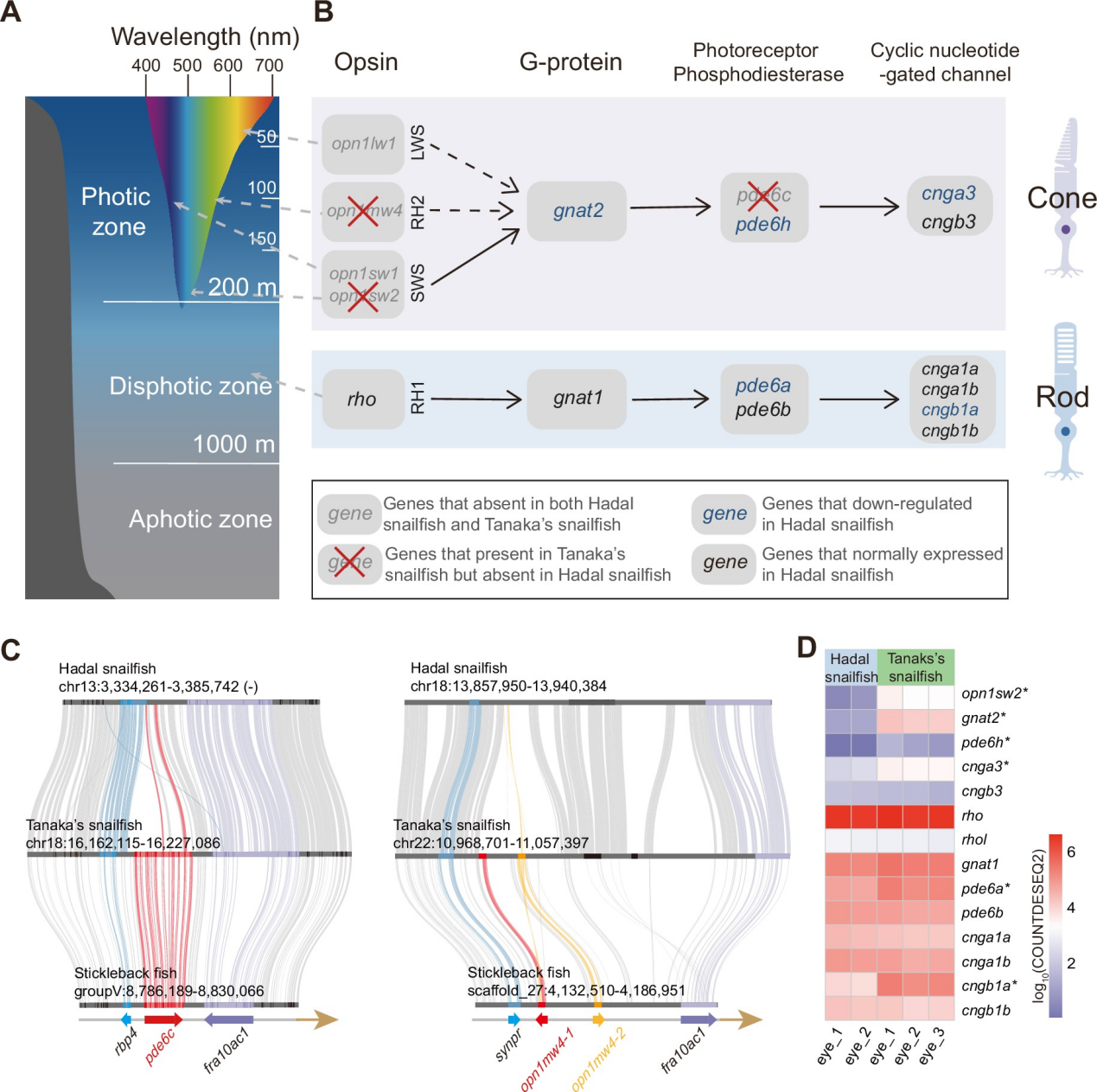 該研究還關注了深淵獅子魚在進化過程中對黑暗的適應。相較與細紋獅子魚,深淵獅子魚視覺系統中多個感光相關基因發生丟失,此外,感光元件的表達水平在不同深度上也發生了顯著變化,這表明其在深海環境中對視覺的需求相對較低。進一步研究發現,與節律相關的基因也發生丟失或假基因化,表明深淵獅子魚的生物鐘可能仍然存在,但不再基于光的調控。