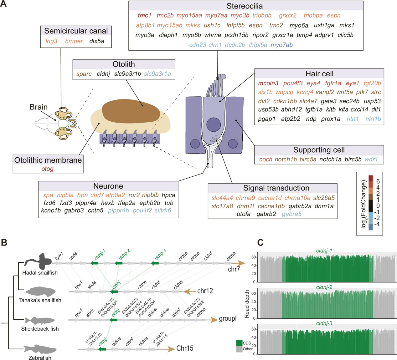 由于缺乏光線,聽覺似乎對深淵獅子魚的生存至關重要。研究發現,聽覺相關基因cldnj在深淵獅子魚基因組中拷貝數增加,該基因是耳石形成所必需的基因。轉錄組數據也表明深淵獅子魚聽覺相關蛋白表達量顯著增加。