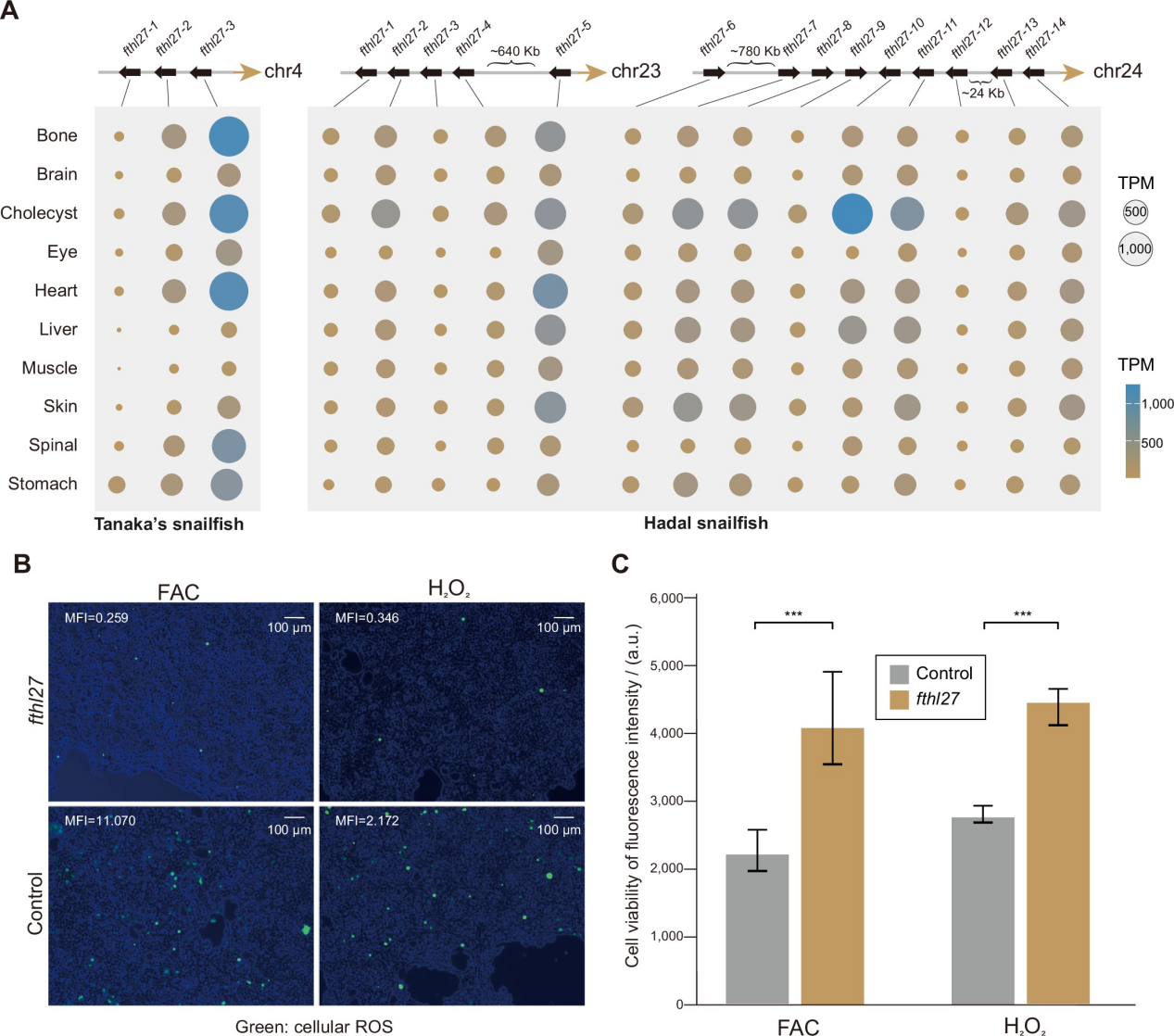值得注意的是,轉鐵蛋白編碼基因fthl27在深淵獅子魚基因組中發生串聯重復(14個拷貝),進一步的細胞實驗證明,fthl27過表達細胞內ROS水平顯著降低,并具有顯著更高的細胞活力。這增加了深淵獅子魚在高靜水壓力下對氧化應激的耐受力,可能是其適應高壓環境的重要因素之一。