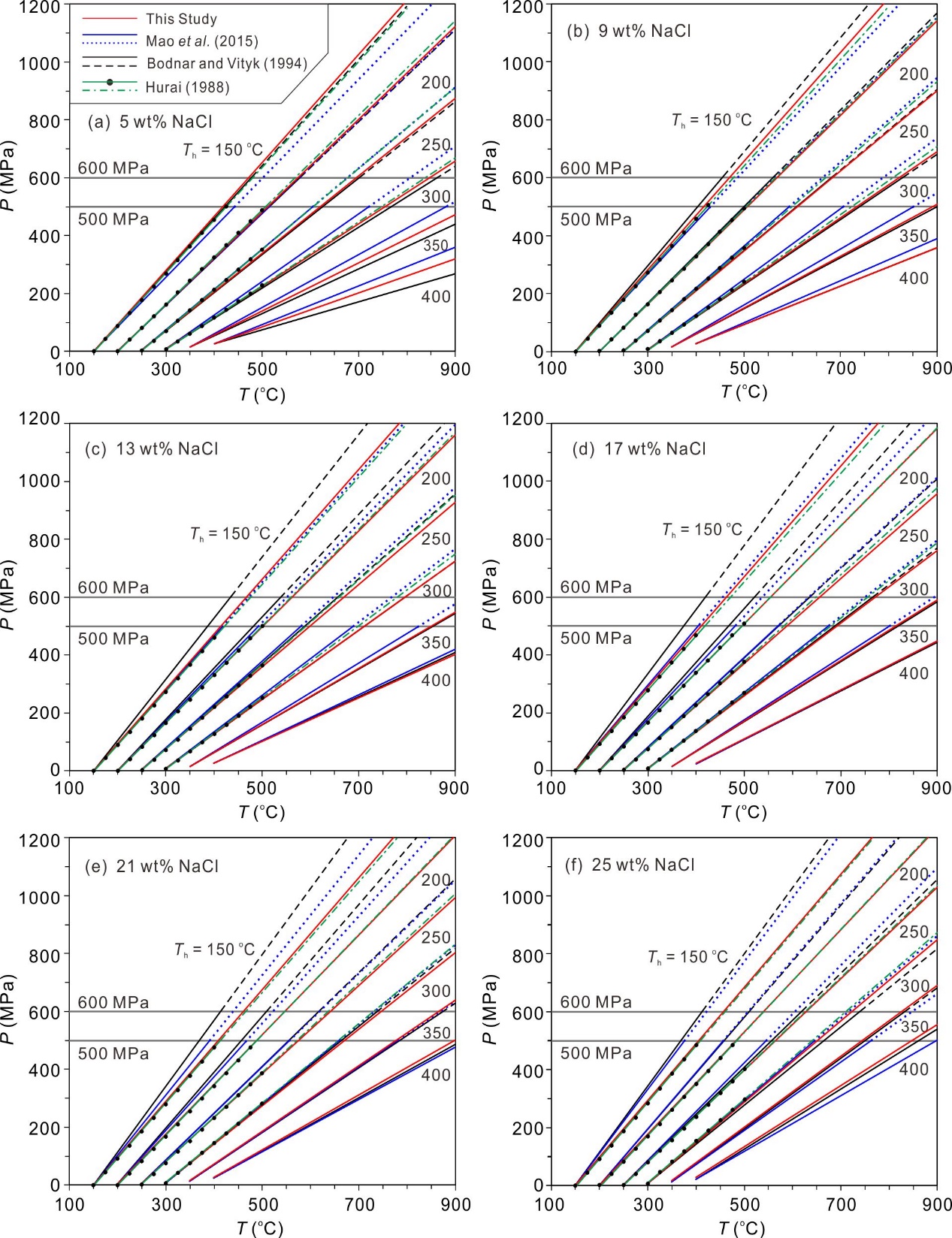 新測定的等容線適用的鹽度范圍為5?25 wt % NaCl, 氣→液均一溫度為100–450 oC, 溫壓條件高達~900 oC、1.2 GPa(圖1)。與前人數據的對比及在超高壓變質帶流體包裹體中的應用表明,所測定的等容線具有高精度、適用溫壓條件廣的優勢。同時,論文提供了一種快速、準確測定LiCl、NaCl、KCl、MgCl2 和CaCl2等鹵水體系及其混合流體的等容線的方法,對地質流體的研究具有重要意義。