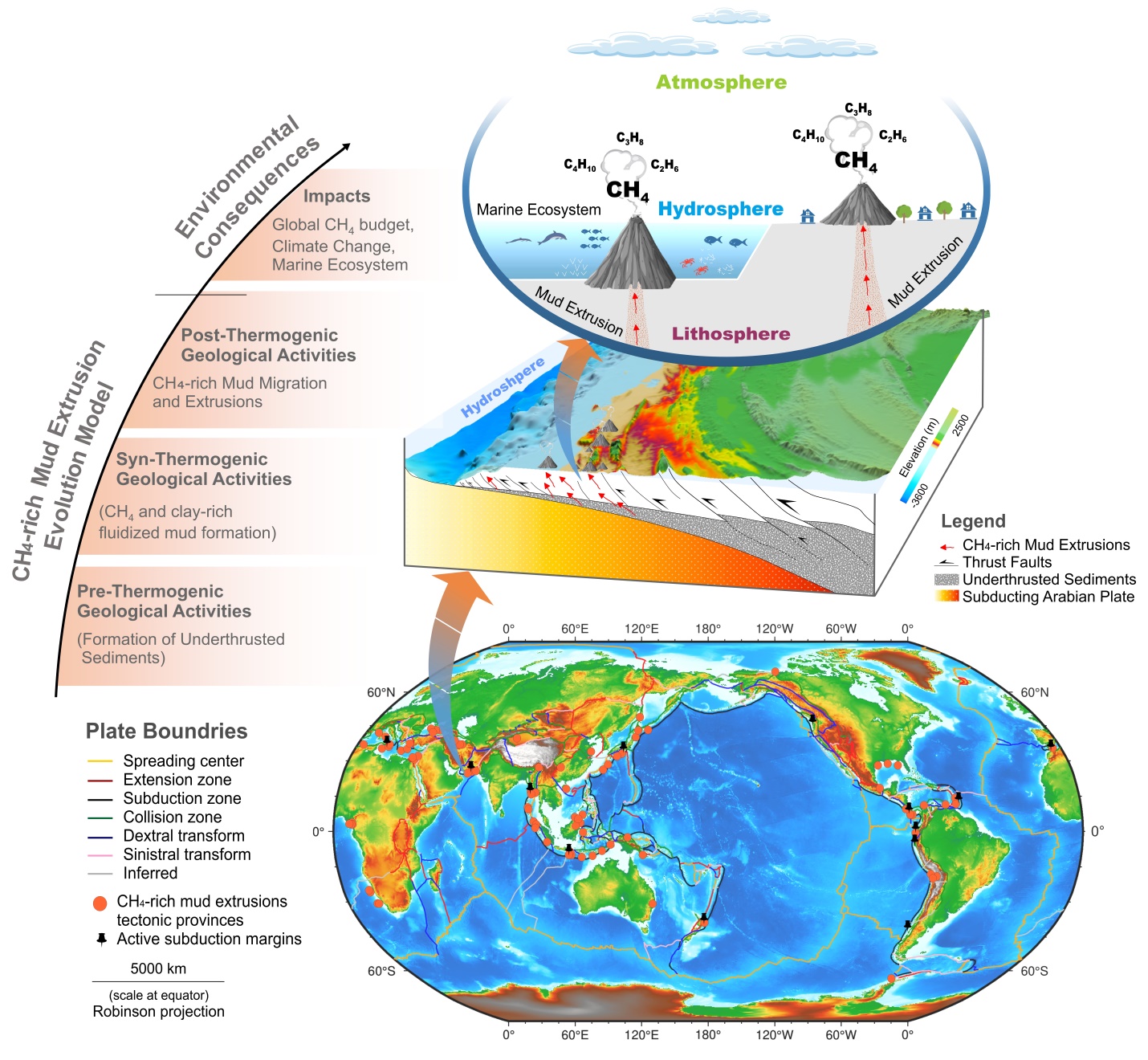 圖1.?俯沖帶中富含CH4的泥火山的地球化學(xué)循環(huán)、構(gòu)造驅(qū)動(dòng)因素及環(huán)境影響