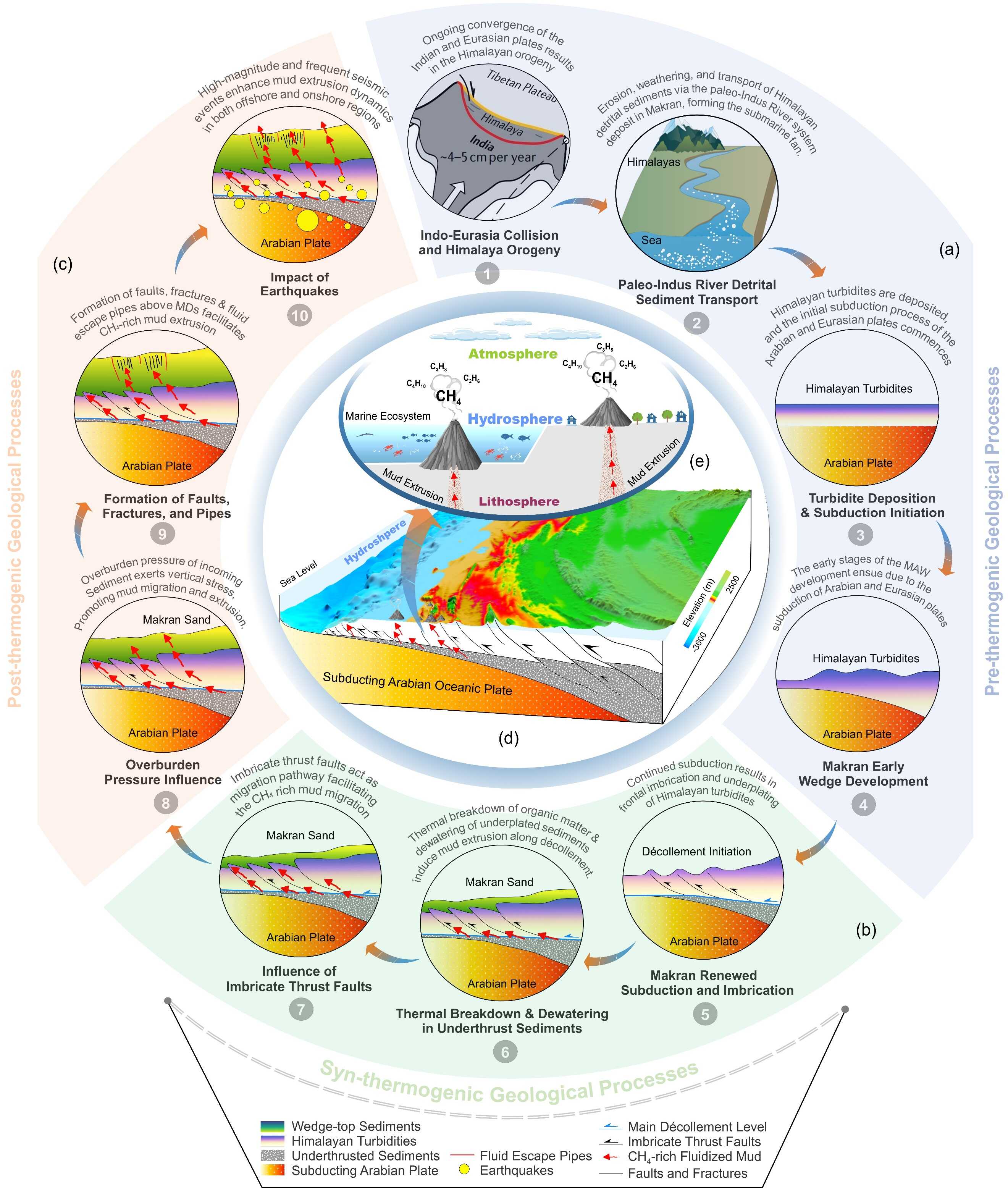 然而,關(guān)于富 CH? 泥火山的地質(zhì)起源以及俯沖相關(guān)的地球化學(xué)和構(gòu)造機(jī)制在活動(dòng)俯沖邊緣中的作用仍存在關(guān)鍵空白。本研究采用多學(xué)科方法,結(jié)合地球物理、地質(zhì)和地球化學(xué)數(shù)據(jù)集,提出了 Makran Subduction Zone 中富 CH? 泥火山的新演化模型。Makran Subduction Zone 因其獨(dú)特的地質(zhì)特征(包括世界上最大的增生楔、高地震潛力和活躍的富 CH? 泥火山)而成為理想的研究模型系統(tǒng)。