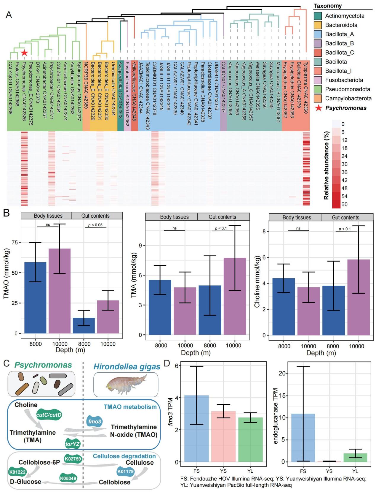 氧化三甲胺(TMAO)是一種滲透調(diào)節(jié)物質(zhì),在滲透壓調(diào)節(jié)以及在高靜水壓條件下維持細(xì)胞完整性方面發(fā)揮著重要作用。檢測(cè)發(fā)現(xiàn),隨著深度增加,鉤蝦腸道內(nèi)容物中TMAO濃度顯著升高,體組織中也呈現(xiàn)類(lèi)似趨勢(shì)。鉤蝦自身編碼fmo3基因,可將三甲胺(TMA)轉(zhuǎn)化為T(mén)MAO。而其優(yōu)勢(shì)共生菌Psychomonas的基因組中攜帶cutC和cutD基因簇,可將膽堿分解為T(mén)MA;同時(shí)擁有torYZ操縱子,可以將TMAO還原為T(mén)MA,從而調(diào)控宿主體內(nèi)的TMAO濃度,形成動(dòng)態(tài)平衡。