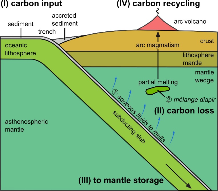 圖1. 以深部碳循環為視角的俯沖帶示意圖。碳通過多種途徑參與深部循環:(I)沉積巖和大洋巖石圈(即地殼和巖石圈地幔)巖石向俯沖帶輸入碳。(II)在俯沖過程中,碳通過脫揮發分作用、溶解及部分熔融等方式從俯沖板塊中釋放。(III)部分碳被進一步帶入地幔深處并儲存;(IV)一部分碳通過弧火山作用重新返回地表。需要注意的是,俯沖板片中碳的釋放可以用兩種端元模式來解釋。①傳統模式:認為俯沖板塊釋放的流體和熔體導致地幔楔發生部分熔融,從而產生弧巖漿;②混雜巖(mélange)模式:認為俯沖板塊的沉積物、蝕變洋殼和水化的地幔物理混合形成的混合巖,以底辟(diapirs)的形式上升到地幔楔,熔化后產生弧巖漿。