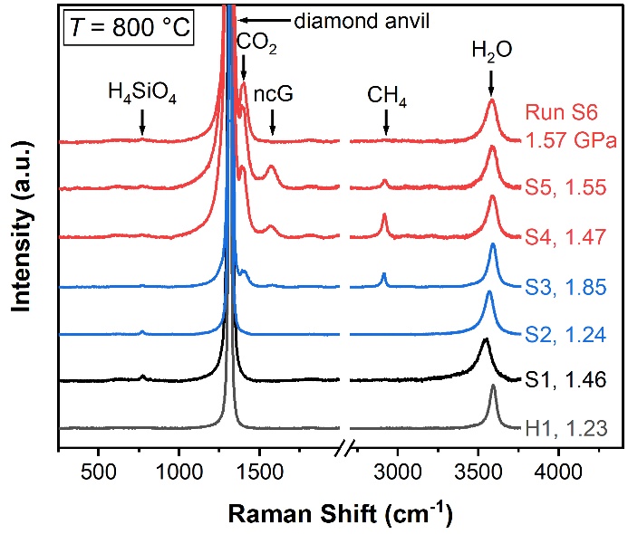 該研究聚焦于俯沖帶中的含碳流體。這些流體在地球深部碳循環和全球氣候變化中發揮著關鍵作用(圖1)。鑒于地球內部以硅酸鹽為主,含水流體中碳-硅種型(C-Si species)的存在性對于評估從俯沖板塊到地幔楔塊并最終到地球表面的碳通量的規模至關重要,但該存在性仍然存在爭議。為了解決這一爭議,我們在與以往實驗研究相當的俯沖帶條件下,利用可視反應腔(例如,熱液金剛石壓腔)和拉曼光譜儀對含有碳和硅的高溫高壓流體進行了全面的原位調查。實驗結果顯示,在接近C-CO2緩沖劑的氧化條件下,未發現任何碳-硅種型存在的證據(見圖2)。值得注意的是,在還原條件下,在不含硅酸鹽的含CH4高溫流體甚至是純CH4氣相中,出現了一個靠近CH4主峰的肩峰(圖3)。這在以前被解釋為碳-硅種型的證據,我們的結果表明它只是來自CH4的熱峰。因此,俯沖帶流體中不大可能存在碳-硅種型,我們無需根據該假設調整現有的深部碳循環模型。