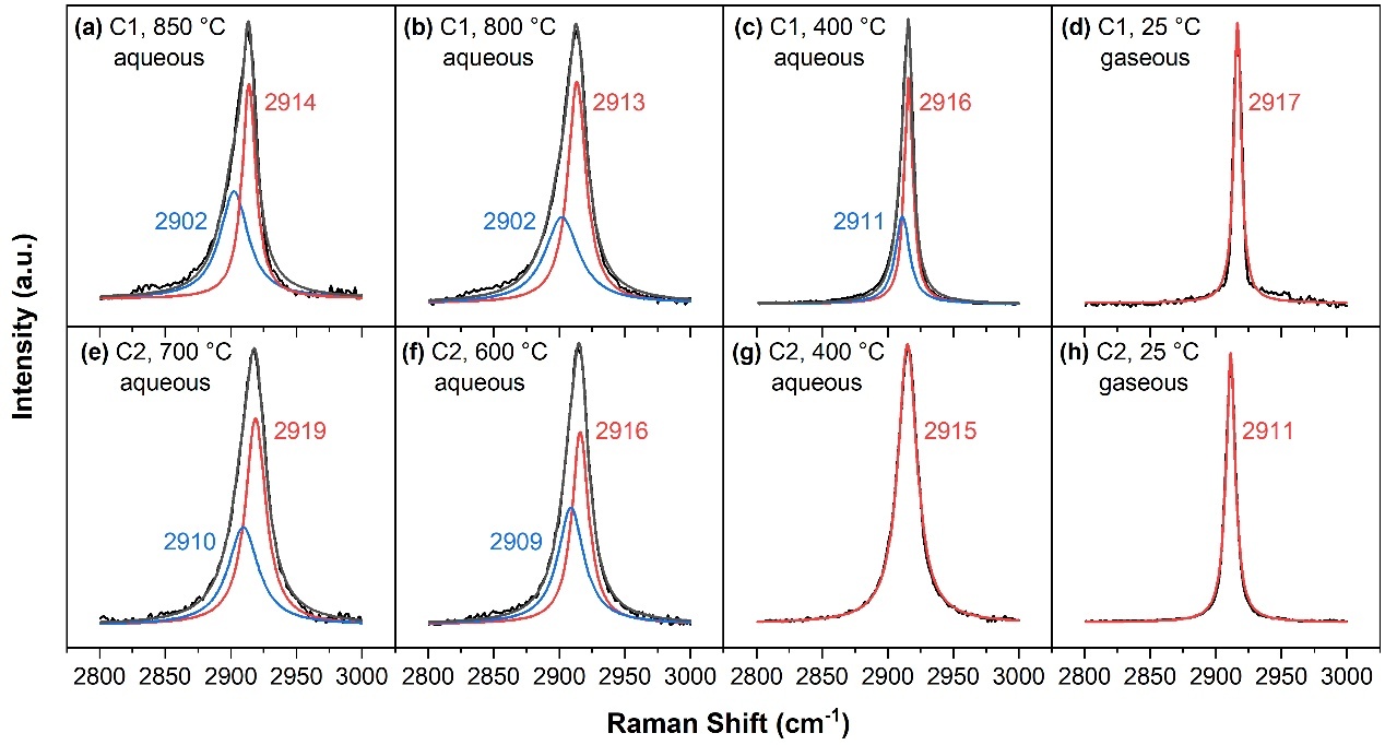 圖 3 2800-3000?cm-1波長區域內從高溫到低溫還原的含CH4的含水流體和氣相的拉曼光譜擬合結果。在C1實驗中,鋯石被用作壓標。800和850 ℃的拉曼光譜是在加熱過程中收集的,而400和25 ℃的光譜則是在達到最高溫度后冷卻過程中獲得的。在C2實驗中,沒有使用壓標,以消除潛在的硅酸鹽干擾。600和700 ℃的拉曼光譜是在加熱過程中采集的,而400和25 ℃的拉曼光譜是在達到最高溫度后冷卻過程中采集的。請注意,紅色曲線表示擬合的CH4主峰,藍色曲線表示擬合的肩峰。